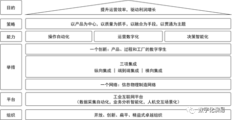 如图1所示,“制造业数字化转型框架”分别从目的、策略、能力、举措、平台、组织等角度,以从目的到组织,从业务到技术,层层分解的方式去认识制造业的数字化转型,力争帮助制造型企业对数字化转型有个全景认识,同时又能以点带线,以线带面,以面带体的方式来规划和实施自身的转型工作。