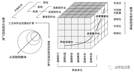 (2)运营数字化 运营数字化所针对的是制造型企业日常运营中的计划、组织、沟通、协调、控制等业务活动。从业务领域或职能的广度上来说,包括数字化生产计划与控制、数字化设备维护、数字化能源管理、数字化采购供应链、数字化质量保证,等等。从数字化应用的特点和深度来说,包括业务的网络化、可视化和透明化。