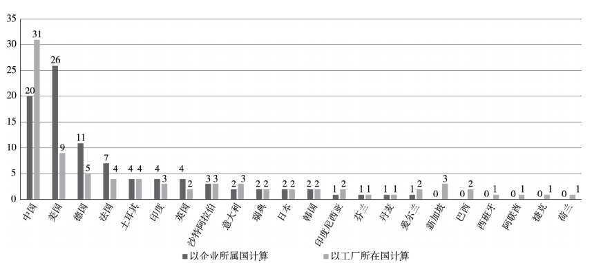 图 1 以企业所属国计算和以工厂所在国计算的各国 “灯塔工厂”数量