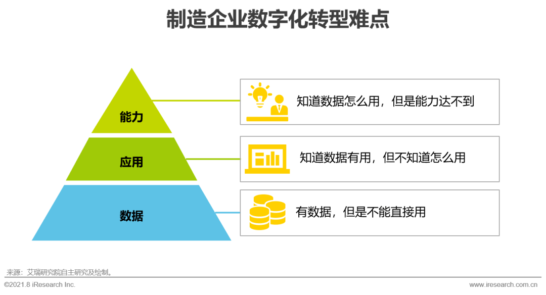 (二)知道数据有用,但不知道怎么用:制造业企业数字化起步相对较晚,数据在实际业务中的应用少,业务价值尚未被充分验证。企业内对数据的应用多为简单的数据收集、统计、对比,对数据进行深挖与洞察方面仍存在大量不足,未能将数据分析方法与实际业务场景决策、流程相结合,缺乏数据应用实践案例。以研发及营销为例,研发信息获取仍以传统的问卷调研、入户访谈为主,营销端目前缺乏基于售后数据的分析与运用,数据仍更多的应用于销售达成统计,研发及营销尚未以数据驱动挖掘消费者关注点和使用痛点,构建业务策略的落地应用。数据价值论证的滞后性将降低员工主动推进业务数字化转型的积极性,延缓企业业务整体数字化转型步伐,使得企业难以构建在数字化时代的“先发优势”。