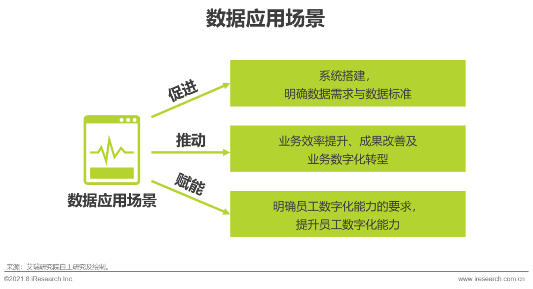 二、从数据应用场景出发,寻找破局之法 数据来源于业务,也终将反哺业务,数据应用场景贯穿于市场机会识别环节、产品研发、运营策略优化、营销决策等各个业务环节。以业务应用场景的线上化、数字化、智能化为切入点,基于业务实际需求完善系统建设、沉淀整合数据、搭建数据应用场景并提升人员数字化水平,是推动业务效率提升和业务成果改善的关键破局点。