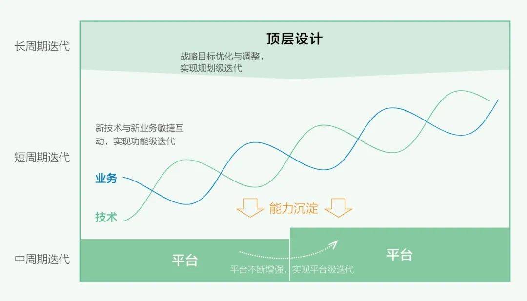 而且还要将短周期迭代中的成功经验不断沉淀到平台之中,因为在失败的短周期迭代中往往也会有闪光点,不能错失每一个有价值的积累。平台能力级的“中周期”迭代有助于将转型能力持续做厚。
