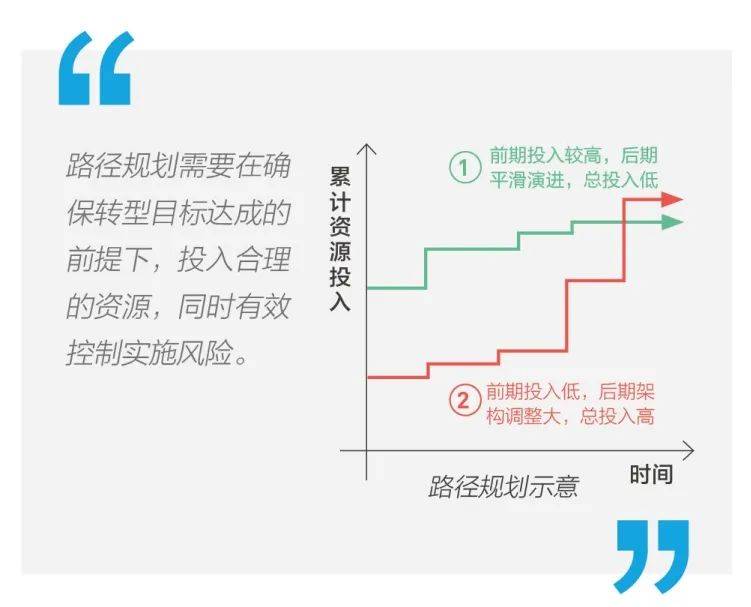 其中,制定转型蓝图是这一阶段的核心工作:一方面要保证转型目标的有效落地,具备可实施性;另一方面还要保证转型在未来的可演进、可持续发展。因此,良好的组织架构设计是其中的关键点。