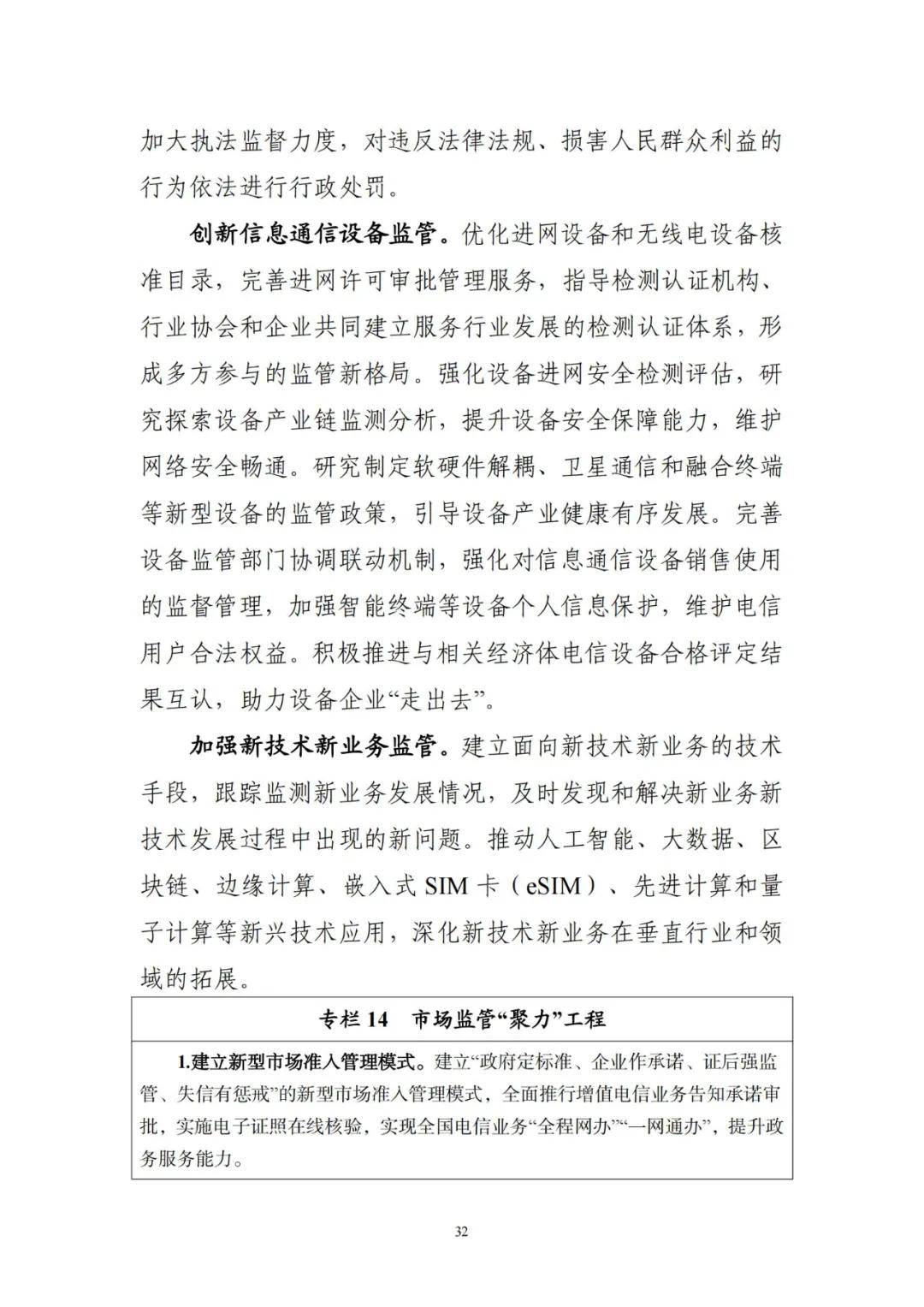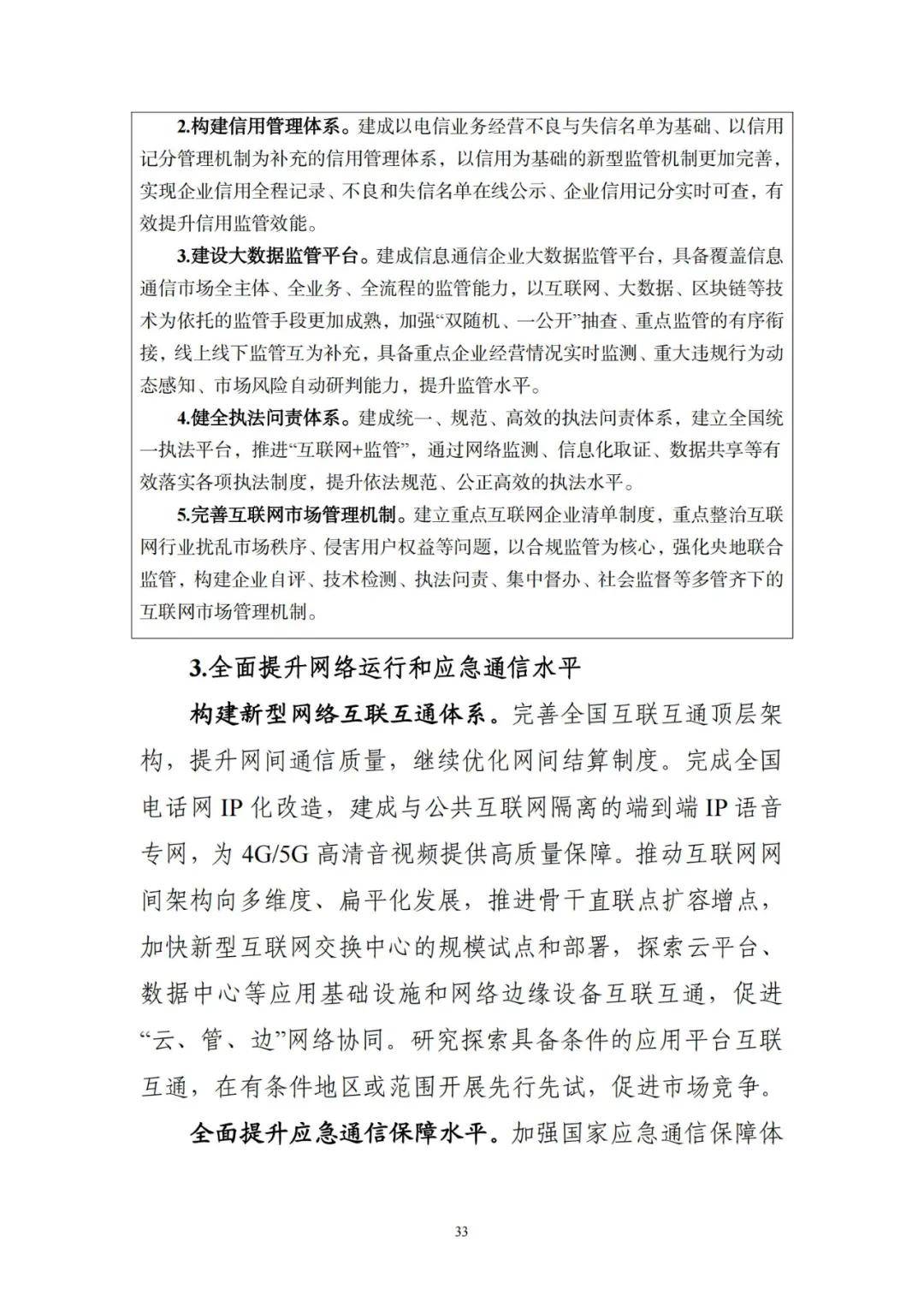 在构建新型行业管理体系方面,要出台物联网、工业互联网、太赫兹等专题频率规划,支持新型基础设施建设。完善频率资源管理的全流程管理机制建设,建立涵盖划分、规划、许可、监督、评价、调整、回收的频谱资源闭环机制。拓展工业互联网资源管理,落实《工业互联网标识管理办法》,加强工业互联网标识解析根节点建设和对接,提升国家顶级节点对标识、域名等网络基础资源支撑能力。建立标识编码分配协调机制,引导标识解析根节点运行机构、国家顶级节点运行机构、标识注册管理机构、标识注册服务机构和递归节点运行机构规范建设发展,提升标识解析体系治理能力。与此同时,还要推动完善电信服务相关法律法规和标准,研究制定5G服务、工业互联网、云计算以及主要互联网应用的服务标准规范。
