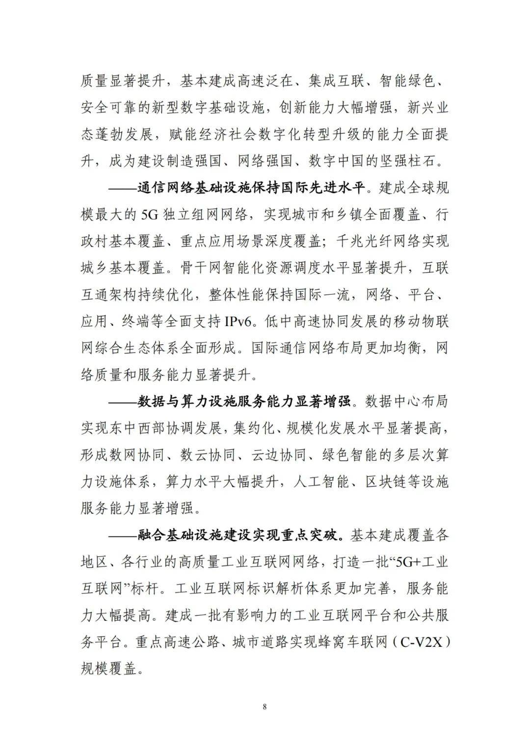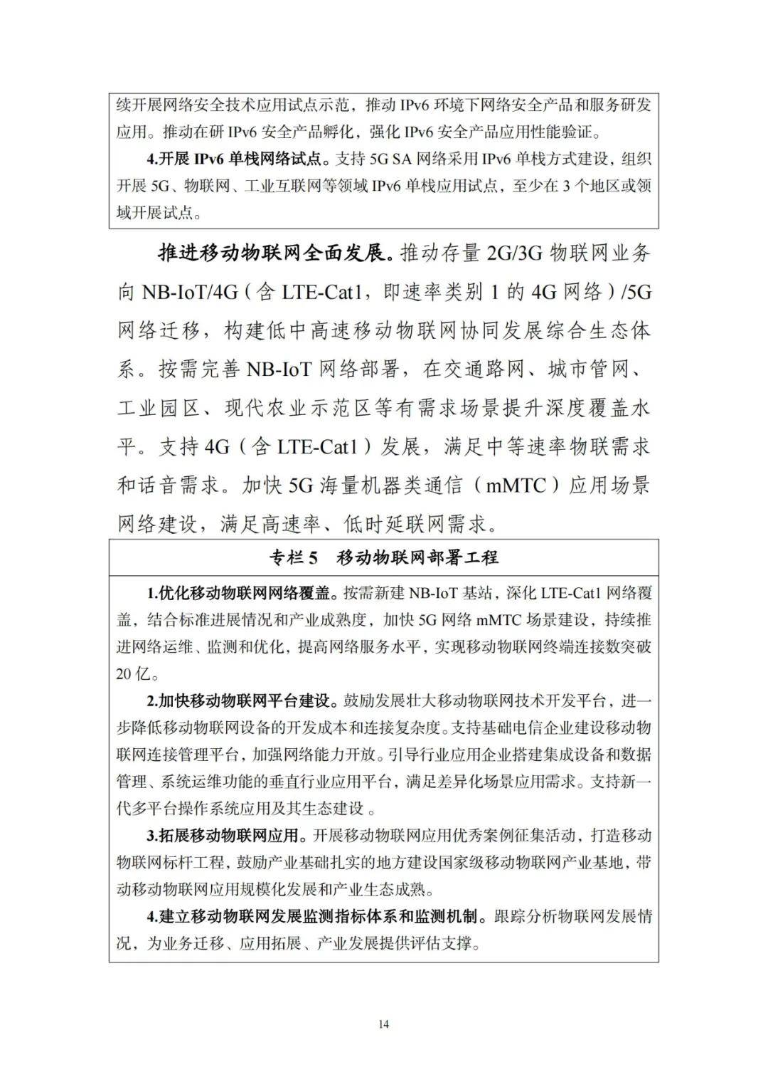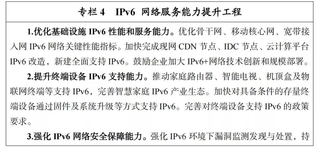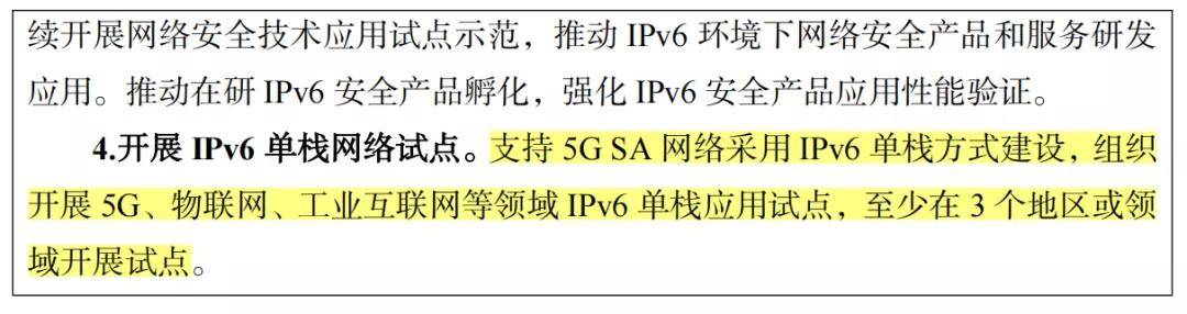 其中,在建设新型数字基础设施方面,要积极稳妥发展工业互联网和车联网,构建以技术创新为驱动、以新一代通信网络为基础、以数据和算力设施为核心、以融合基础设施为突破的新型数字基础设施体系。推动IPv6与人工智能、云计算、工业互联网、物联网等融合发展,支持5G SA网络采用IPv6单栈方式建设,组织开展5G、物联网、工业互联网等领域IPv6单栈应用试点,至少在3个地区或领域开展试点。