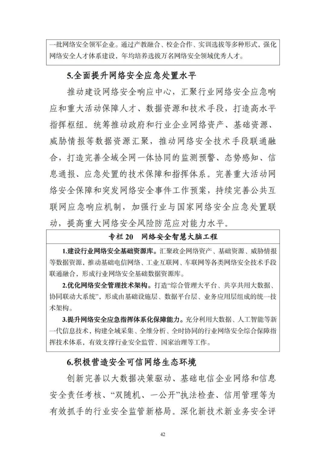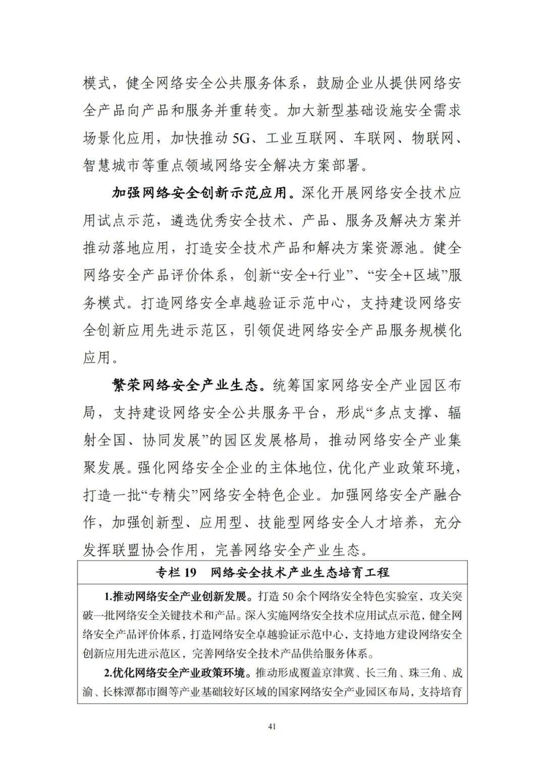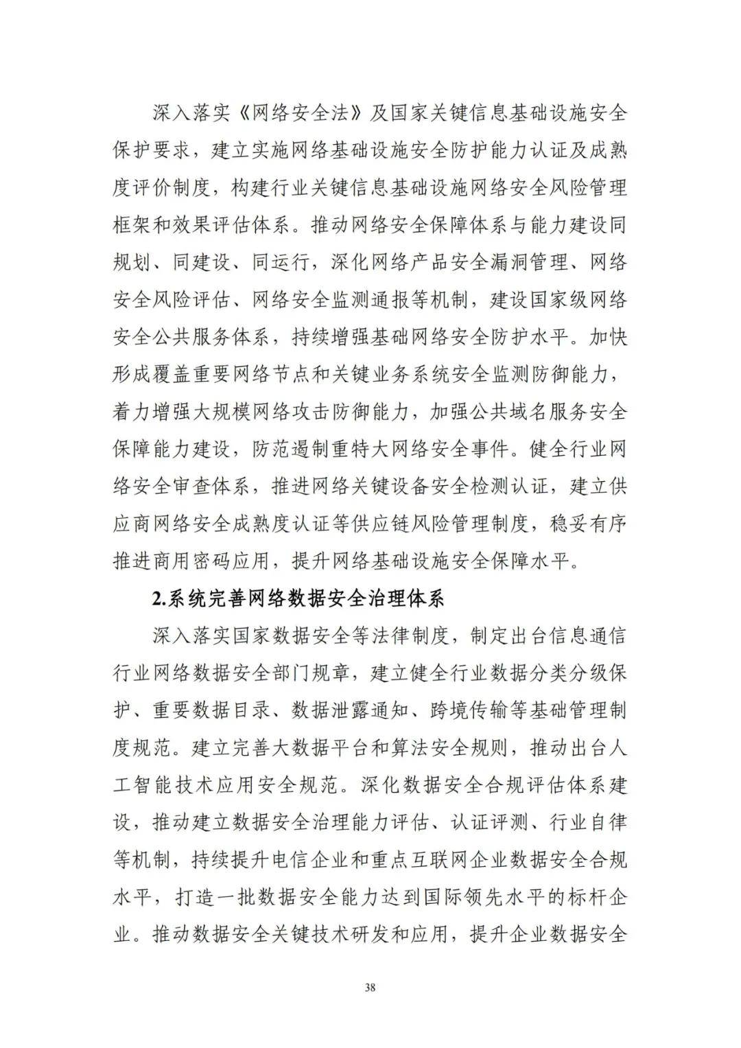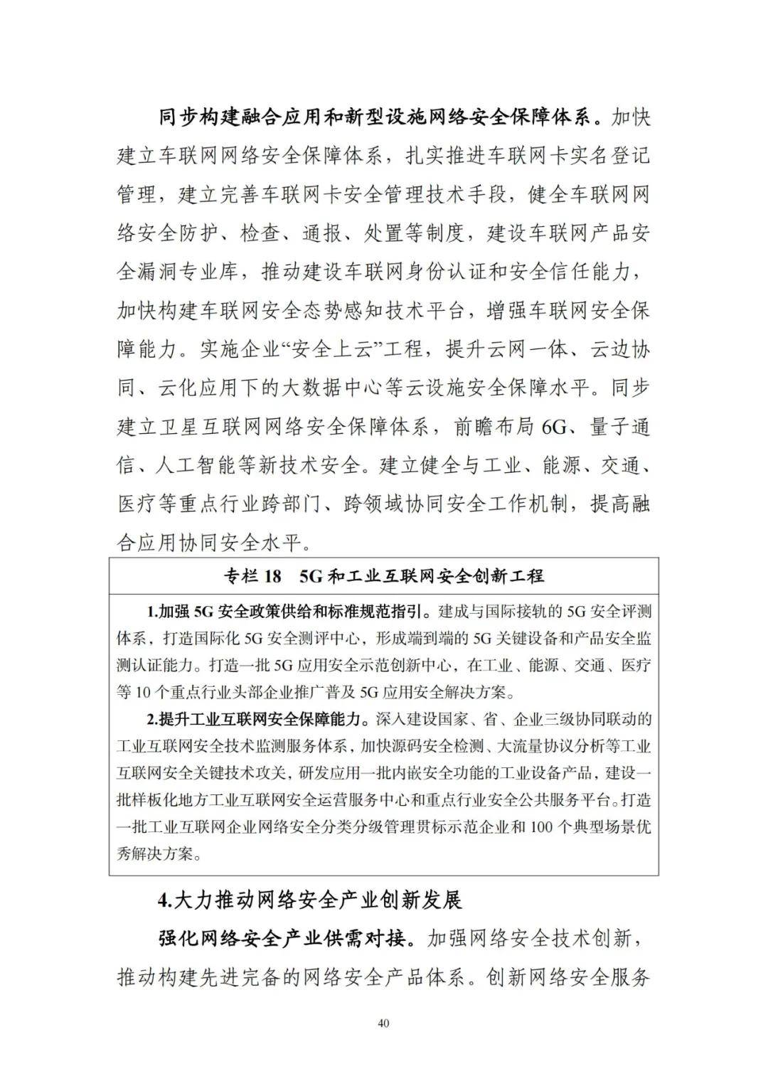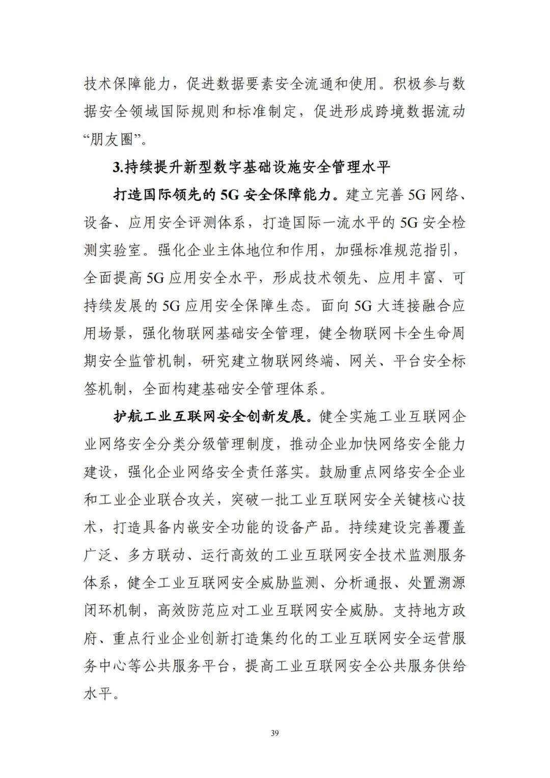在全面加强网络和数据安全保障体系和能力建设方面,要护航工业互联网安全创新发展,健全实施工业互联网企业网络安全分类分级管理制度,推动企业加快网络安全能力建设,强化企业网络安全责任落实。鼓励重点网络安全企业和工业企业联合攻关,突破一批工业互联网安全关键核心技术,打造具备内嵌安全功能的设备产品。持续建设完善覆盖广泛、多方联动、运行高效的工业互联网安全技术监测服务体系,健全工业互联网安全威胁监测、分析通报、处置溯源闭环机制,高效防范应对工业互联网安全威胁。支持地方政府、重点行业企业创新打造集约化的工业互联网安全运营服务中心等公共服务平台,提高工业互联网安全公共服务供给水平。加大新型基础设施安全需求场景化应用,加快推动5G、工业互联网、车联网、物联网、智慧城市等重点领域网络安全解决方案部署。