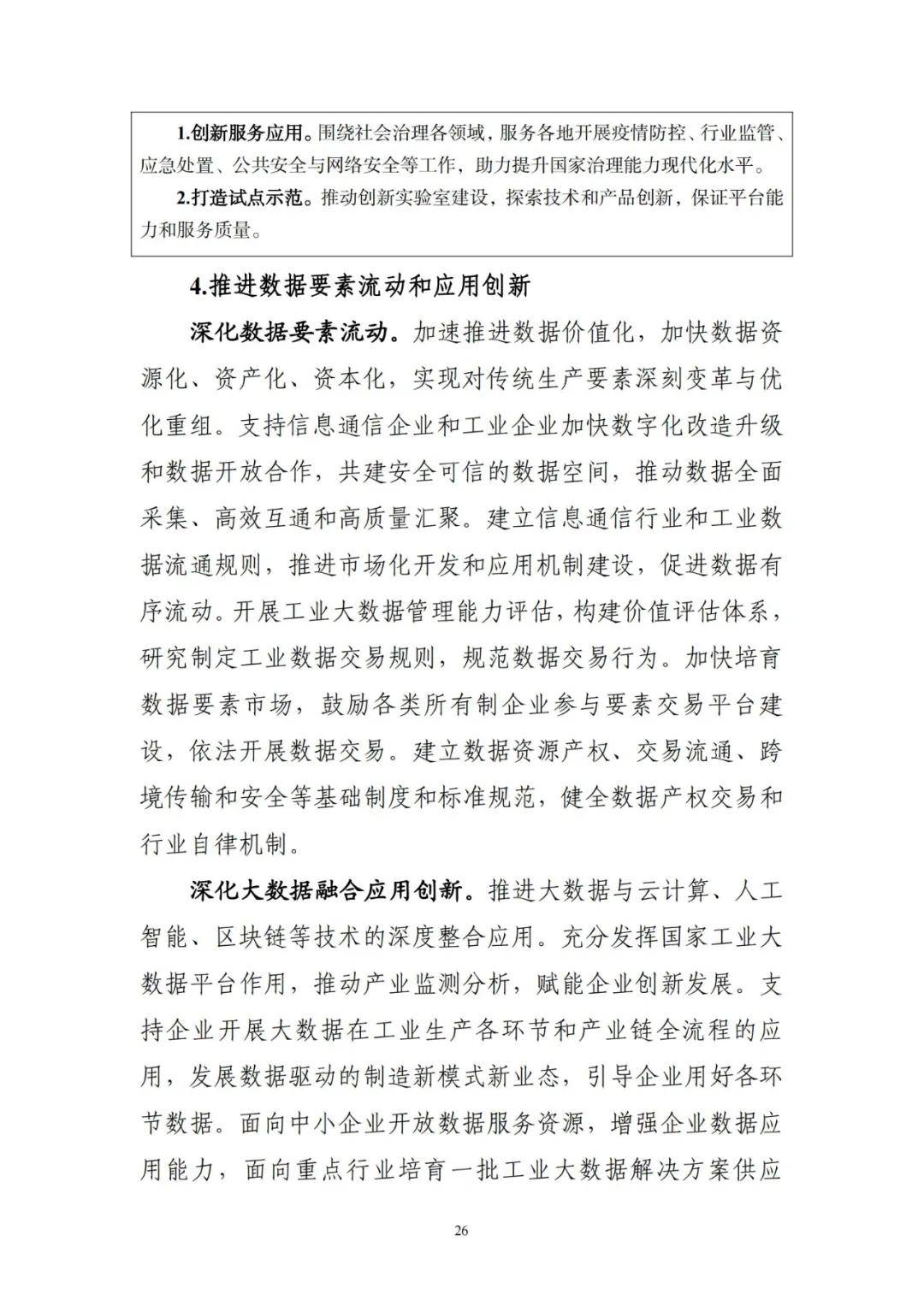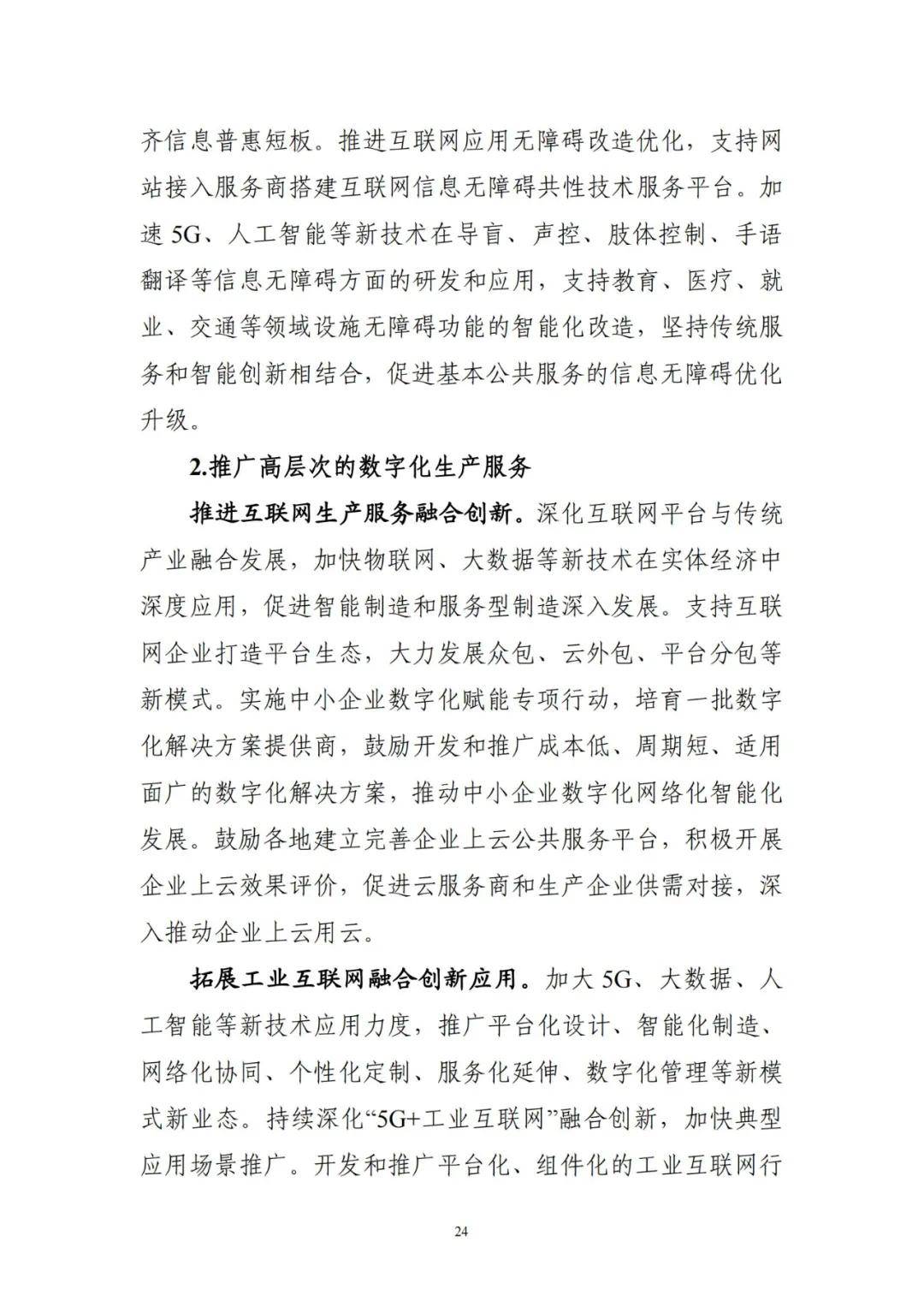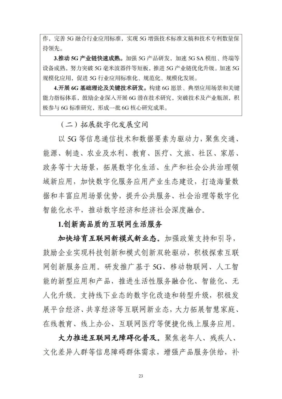 在拓展数字化发展空间方面,要拓展工业互联网融合创新应用。加大5G、大数据、人工智能等新技术应用力度,推广平台化设计、智能化制造、网络化协同、个性化定制、服务化延伸、数字化管理等新模式新业态。持续深化“5G+工业互联网”融合创新,加快典型应用场景推广。开发和推广平台化、组件化的工业互联网行业系统解决方案,推动中小企业上平台、用平台。培育一批基础型、行业通用型和专用型的工业APP。支持第一产业、第三产业推广基于工业互联网的先进生产模式、资源组织方式、创新管理和服务能力。