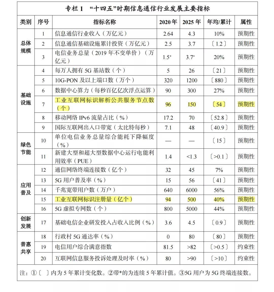 与此同时,“十四五”时期信息通信行业发展主要指标中还提到,到2025年,工业互联网标识解析公共服务节点数达到15个、工业互联网标识注册量达到500亿、5G虚拟专网数达到5000个。