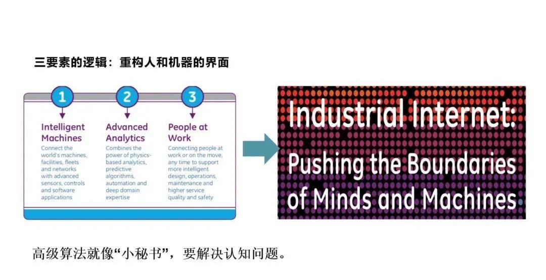 在工业互联网白皮书中,指出了3个要素:智能的机器、高级算法、工作中的人。所谓智能的机器,最基本的要求就是“不聋不哑”(朱铎先先生的说法),能够给人送信息。但人的精力是有限的,难以处理成千上万台设备送来的秒级、毫秒级的数据。所以,需要“高级算法”来帮忙。我把“高级算法”形象地称为“小秘书”,其作用是从数据中发现问题、报告给人。