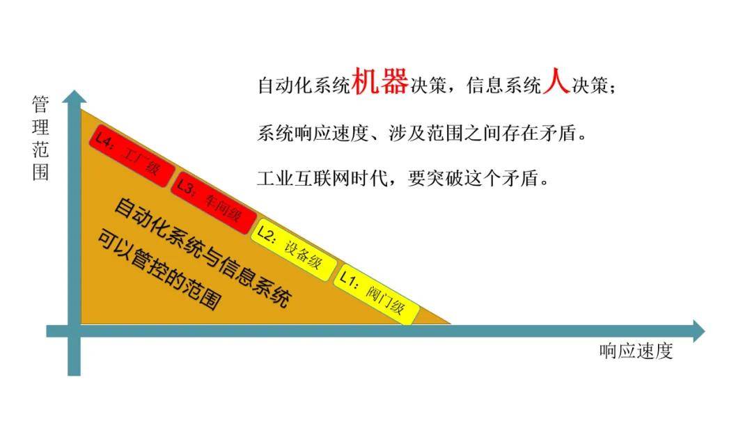 我们知道:过去工厂里的计算机系统是分级的。离散制造业典型的分法是BA、MES、ERP,钢铁行业的典型分法是L1~L4。这些级别的特征是:底层的响应速度快而管控范围小,高层响应速度慢而管控范围大。以钢铁行业为例,L1是阀门级、L2是设备级、L3是车间级、L4是公司级,范围不断扩大。但L1的响应速度是秒级、毫秒级,而L4并不是实时处理的。把管控范围和响应速度放在一起,就能看到原来计算机系统的局限性:限于响应速度慢或者管理范围小的三角形内部。