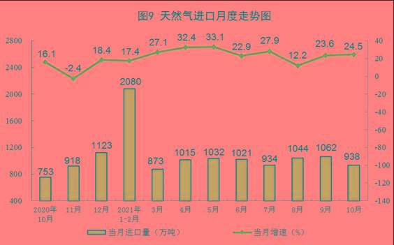 天然气进口快速增长。10月份,进口天然气938万吨,同比增长24.5%,增速比上月加快0.9个百分点。1—10月份,进口天然气9907万吨,同比增长22.3%。
