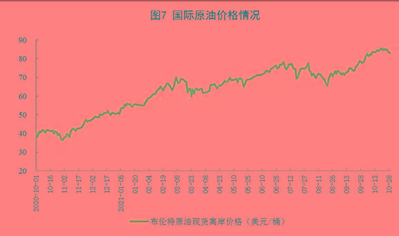 原油进口降幅收窄,国际原油价格上涨。10月份,进口原油3780万吨,同比下降11.2%,降幅比上月收窄4.1个百分点;1—10月份,进口原油42506万吨,同比下降7.2%。10月29日,布伦特原油现货离岸价格为83.1美元/桶,比9月30日上涨6.8%。