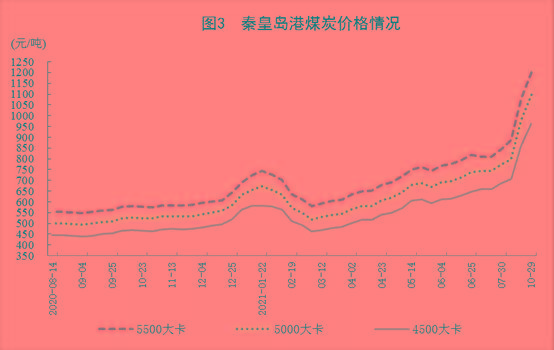 10月29日,秦皇岛港5500大卡、5000大卡、4500大卡动力煤综合交易价格分别为每吨1202元、1096元和961元,比9月24日分别上涨123元、116元和104元。从中国沿海电煤采购价格(综合价)看,11月4日至11月11日当周,5500大卡为每吨1095元,比10月份明显回落。