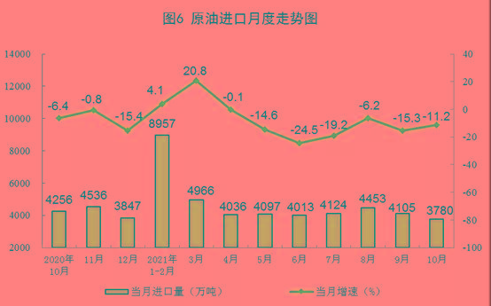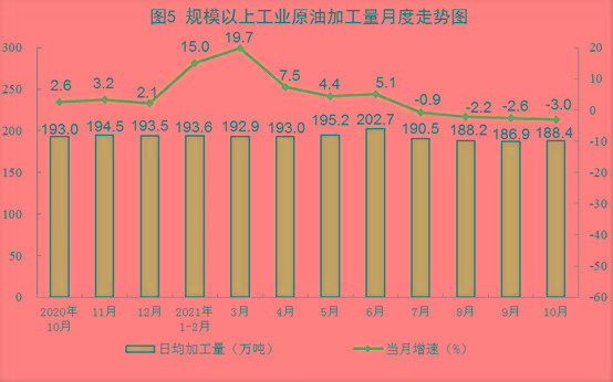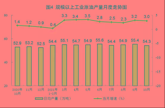 1—10月份,生产原油16619万吨,同比增长2.5%,比2019年同期增长4.2%,两年平均增长2.1%;加工原油58515万吨,同比增长5.2%,比2019年同期增长8.3%,两年平均增长4.1%。