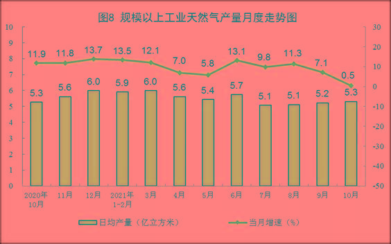 天然气生产增速回落。10月份,生产天然气165亿立方米,同比增长0.5%,增速比上月回落6.6个百分点,比2019年同期增长12.4%,两年平均增长6.0%,日均产量5.3亿立方米。