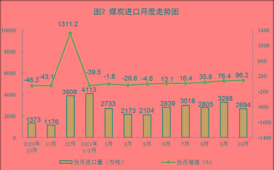 原煤生产由降转升。随着增产保供政策措施落地见效,优质产能加快释放,10月份,生产原煤3.6亿吨,同比增长4.0%,上月为下降0.9%,比2019年同期增长5.5%,两年平均增长2.7%,日均产量1152万吨。进口煤炭2694万吨,同比增长96.2%。
