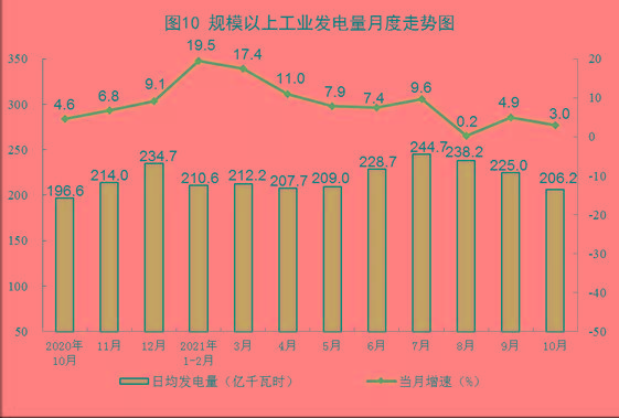 电力生产保持增长。10月份,发电6393亿千瓦时,同比增长3.0%,增速比上月回落1.9个百分点,比2019年同期增长7.7%,两年平均增长3.8%,日均发电206亿千瓦时。1—10月份,发电67176亿千瓦时,同比增长10.0%,比2019年同期增长11.5%,两年平均增长5.6%。
